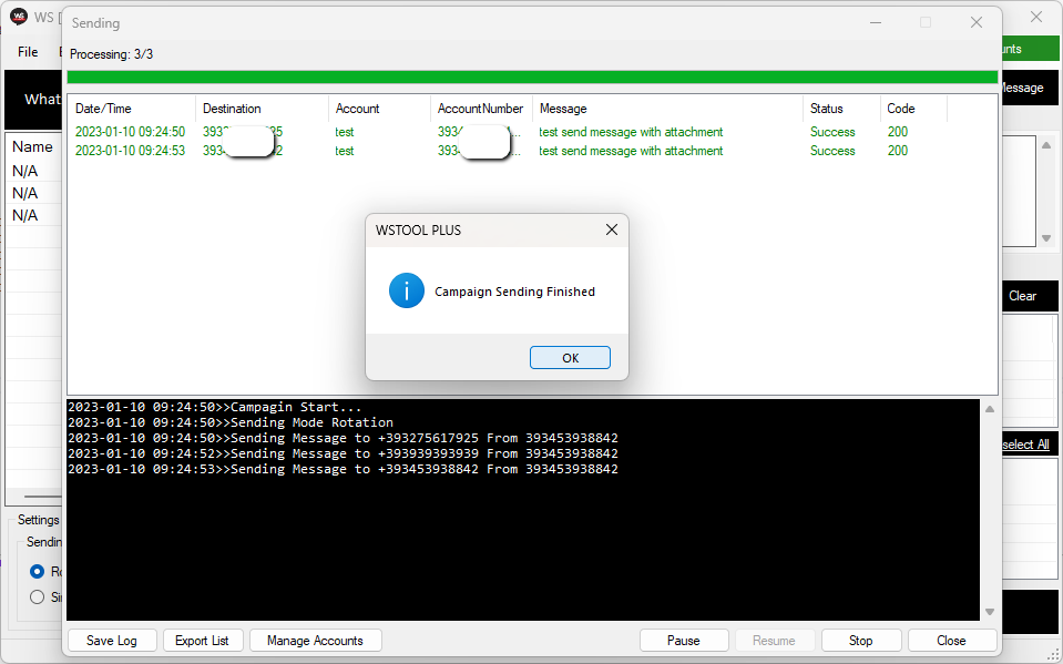 Dopo aver premuto sul pulsante SEND il programma inizierà a inviare tutti i messaggi e vedrai un report dettagliato in tempo reale con i messaggi inviati con successo e quelli non inviati.