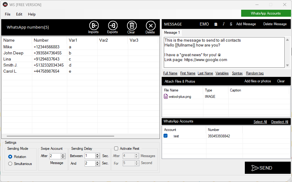 Ciò che rende WSTOOL unico nel suo genere è la possibilità di utilizzare anche più di un account Whatsapp e inviare messaggi usando tutti questi account (in rotazione o in modo simultaneo).