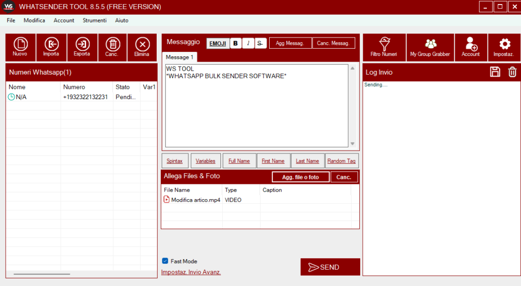 After uploading the contacts it’s time to write the message to send. You can do this from the text box on the right side of the program. In this box you can enter variables (e.g. FullName) to personalize the message as much as possible. You can also insert emojis, make text bold or italics, insert links, and so on.